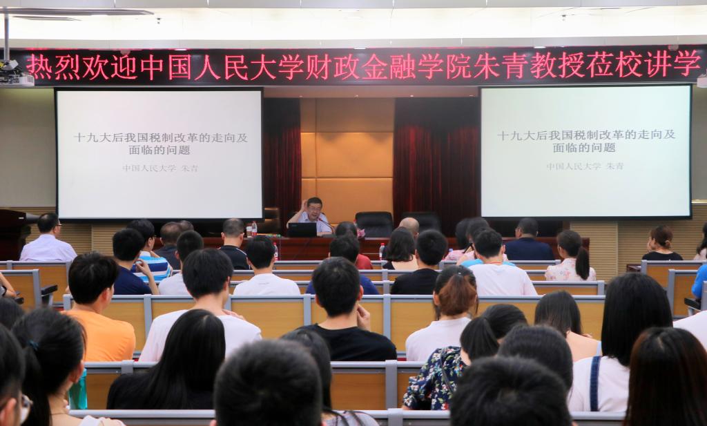 经济学讲堂第一讲在经管12楼多媒体报告厅开讲,中国人民大学财政金融学院教授、博士生导师朱青应邀担任主讲嘉宾,为学院部分本科生以及研究生做了题为“十九大后我国税制改革的走向及面临的问题”的专题讲座,参与本次讲座的还有国税、地税及企业人员。