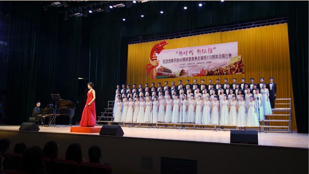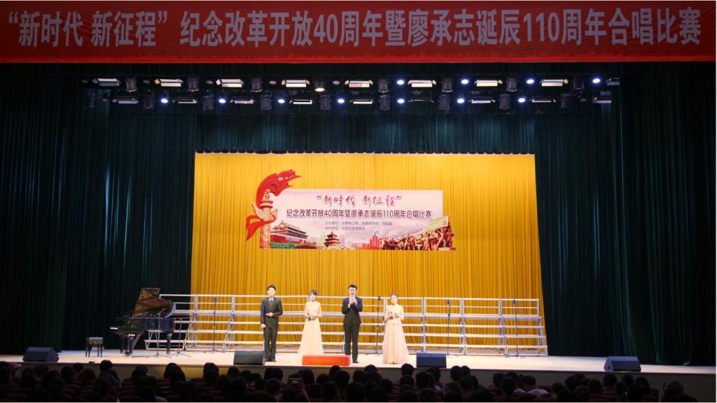 今年是廖公诞辰110周年,为缅怀廖公,在各个学院演唱完毕后,进行了诗歌朗诵《廖公,我们怀念您!》。诗歌朗诵完毕后,全体起立,一起合唱校歌《一方沃土》,整场比赛接近尾声。
