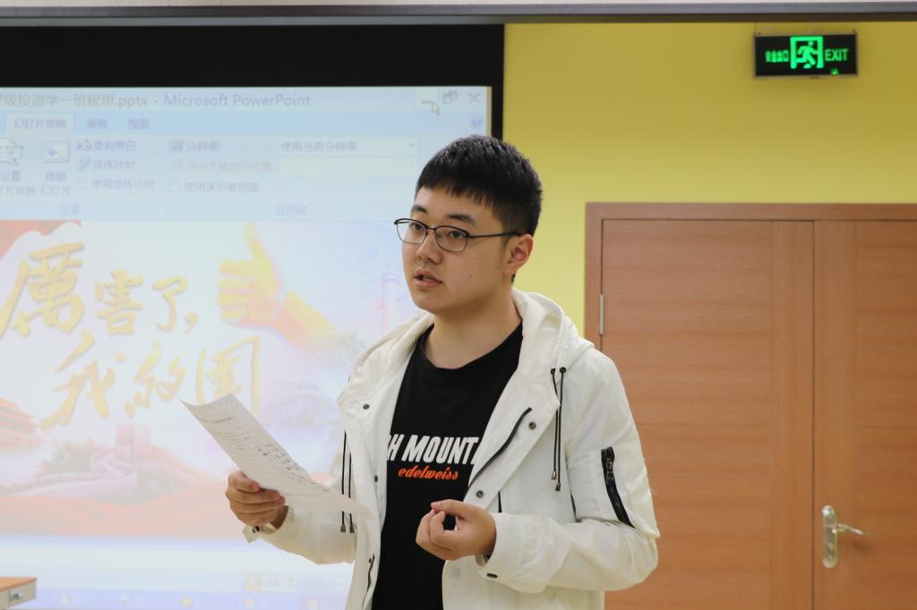 首先是团干部的汇报时间。白雨露的汇报主题为从绿皮火车到高铁,她从外观时速,购票方式,火车票这三个方面的改变详述了中国铁路的发展,并结合自己的亲身实践和一个精短的视频带观众领略了中国铁路的变化。袁佳伟以数据切入主题——腾飞四十年,我与改革共成长,从中国GDP所占世界比重的增长来讲述中国自改革开放后的发展情况,指出了中国改革开放的总体情况,并对改革开放给予了厚望。聂子衿讲述的是中国时代,她先详细的描述了从古代丝绸之路的过程,再展示了近代中国屈辱的历史,然后解释了现代的一带一路的含义与目的,最后通过图片展示了现代中国科技与工业方面的强大。
