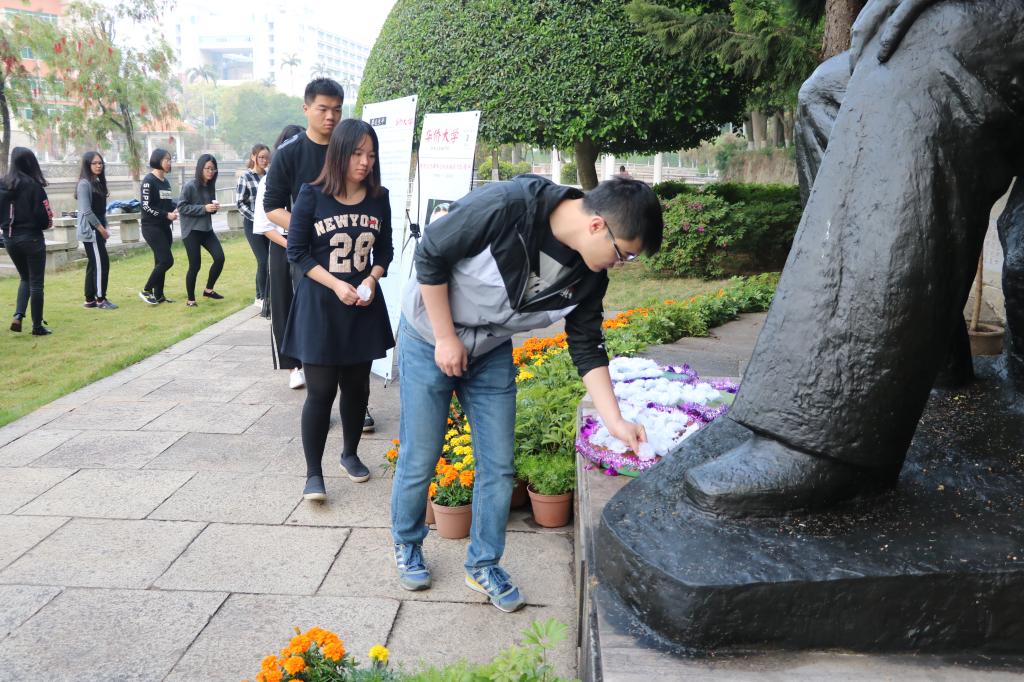 仪式开始,全体人员面朝廖承志铜像郑重地三鞠躬,以表敬意。紧接着,大家神情凝重,在悲伤的音乐中进行了一分钟的默哀。随后,党员和学生代表以饱含深情的诗朗诵——《血浓于水的大学》为这位为华大鞠躬尽瘁的伟人献上我们最真挚的缅怀之情。最后,大家整齐列队,依次走向廖公铜像,瞻仰这位伟人,有序地献上小白花,以寄哀思。廖公铜像前百花环绕,象征着大家对校长深深的敬意。