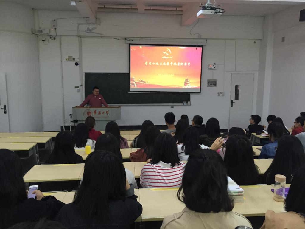党委秘书方鹏飞为大家介绍了学院学习宣传贯彻党的十九大精神活动方案,他说“学习贯彻党的十九大精神,是当前和今后一个时期的首要政治任务,我们每一名党员都要按照学校、学院要求,学深悟透、学通弄懂党的十九大精神。学院党委结合学院工作实际和专业特点,以“七个一”活动为支撑,在全院范围内掀起学习贯彻党的十九大精神的热潮,今天我们集中观看专题片是“七个一”活动之三,希望同学们认真观看、深入领会,将十九大精神融入自己的学习、工作、生活中,真真正正做一名合格的党员。”