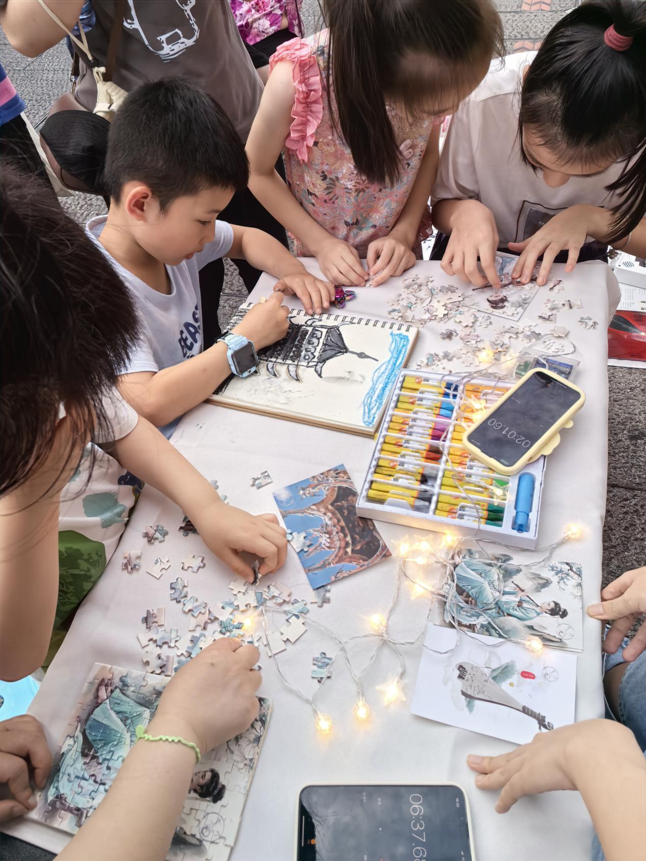 在与泉州市鲤城区人民政府的密切合作下,实践团队开启了南音的传播之旅——西街南音文化展示区。在活动中,团队设置了拼图体验区与文创展示售卖区,吸引了众多市民与游客的关注。活动开始不久,拼图体验区便成为了亲子互动的乐园,在南音优雅深邃的音乐氛围中,团队成员向参与的小朋友与家长们介绍了南音的故事与文化价值。文创展示售卖区不仅推出了拼图、帆布袋、明信片等自制文创产品,还展示了南音社的周年庆与发展历史的书籍,致力于推动南音文化闻名遐迩,薪火相传。此外,团队还利用直播平台,将南音的故事与文创产品展示给更多线上观众,收获了大量点赞与支持。