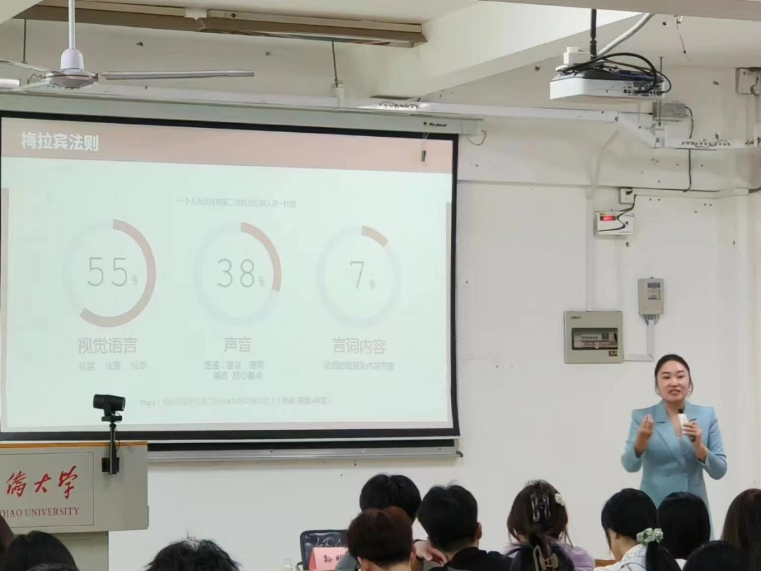 活动开始,孙明蕾老师上台进行发言,强调了礼仪的重要性:一是为今后求职面试奠定基础,二是对外进行工作对接时代表着学院的整体形象,三是良好得体的职业形象体现职业能力。紧接着,孙明蕾老师通过PPT、视频、现场表演相结合的形式,围绕个人形象礼仪,工作交往礼仪,商务礼仪实战应用三个环节对商务礼仪进行了介绍。个人形象礼仪环节,孙老师先是分别教导男女同学如何选择西装、皮鞋,而后还邀请同学上台模拟面试现场,分析面试所需的行为举止相关礼仪,台上台下形成了良好互动;工作交往礼仪环节,孙老师讲解了工作邮件及微信礼仪,又重点介绍了招呼五礼;商务礼仪实战应用环节,孙老师教同学们以五感法记忆接待前期准备,并详细讲解了坐车方面的接待座次规范。