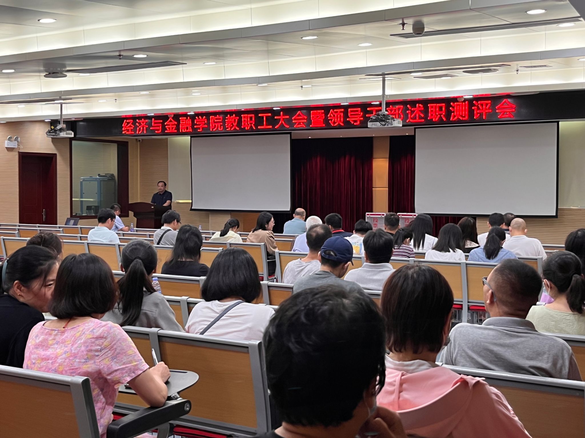 在经管十二楼多功能报告厅召开了教职工大会暨2022-2023学年度中层领导干部述职测评大会,全体教职工参加此次会议。