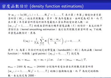 陈教授指出,在函数回归中存在两个限制:一个是密度函数的积分和为1,一个是密度函数要大于零。因此,在做回归时,不能使用传统的方法进行处理。在现有的文献中,有学者使用Composition data method解决这个问题。在陈教授所介绍的文章中,并没有采用大多文献所使用的transformation的方法,而是采用了一个特殊的方法——核平滑估计法进行自然对数月所得薪资下的概率密度函数估计。