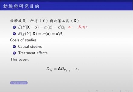 在传统的统计回归中,所谈论的一般是线性模型,在经济中,研究一般重视因果关系或是政策处理效应的分析,而本篇文章主要探究的是前一期的分配和下一期分配之间的动态关系,这也是此篇文章与其他文章的不同之处。