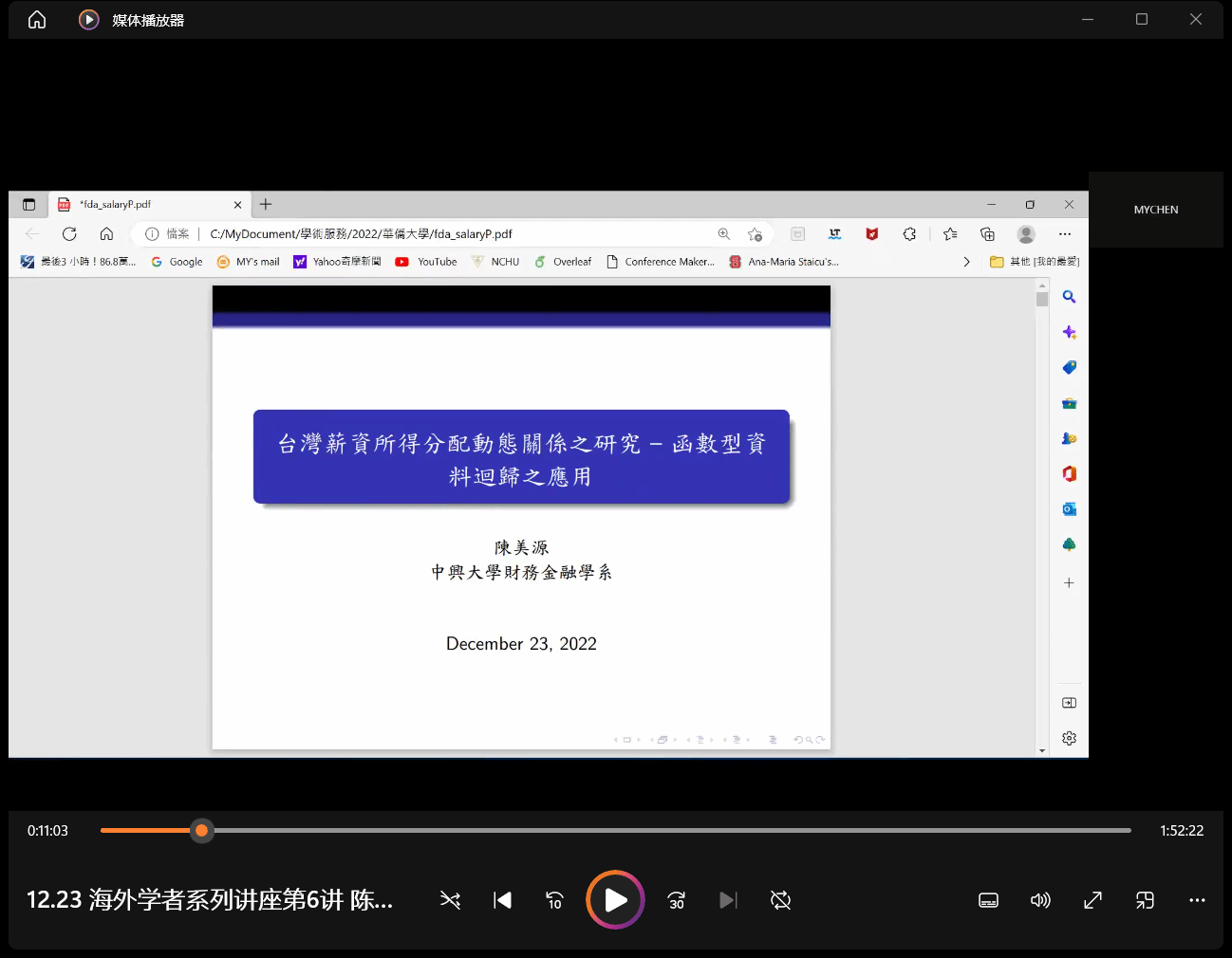 海外学者系列讲座第6讲在线上进行。台湾中兴大学财务金融学系陈美源教授继续为同学们带来题为“家庭薪资所得分配动态关系之研究——函数型资料回归之应用”的讲座。