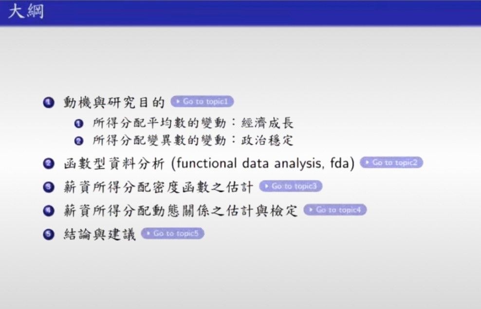 讲座初始,陈教授说明本文主要研究的是台湾薪资分配的动态关系,并为大家展示了文章的大纲。所得分配是一个经济发展的成果,这个成果主要的研究方向是薪资水准的移动、增加和分配方差的变化,如果方差越大,就代表所得分配越不公平。所以,在薪资所得分配上,研究更在乎水准平均数和方差的移动变化。