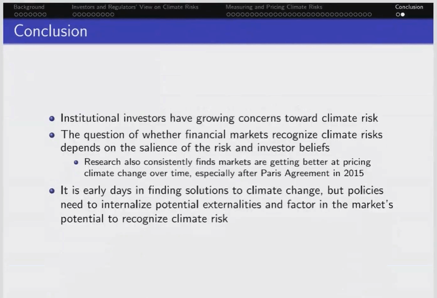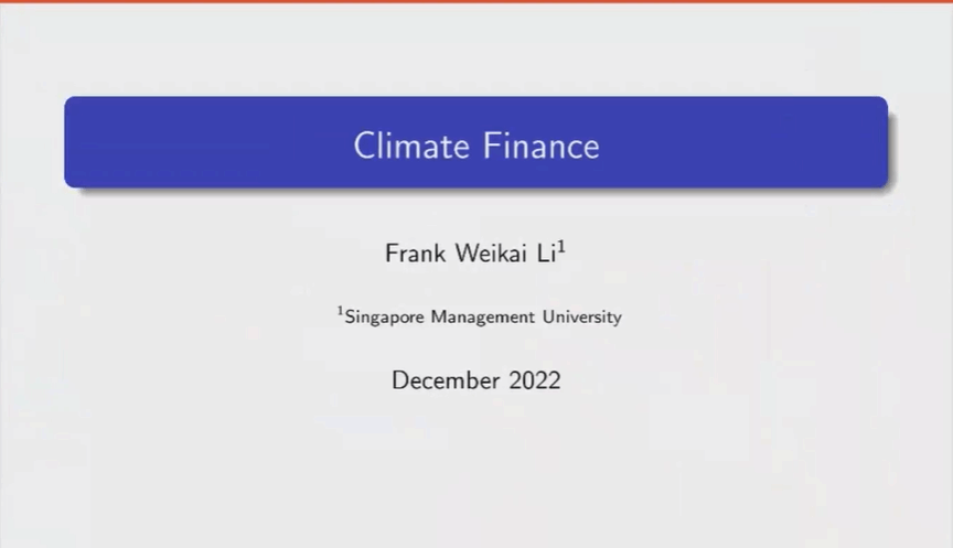 继上一次李伟凯教授关于“ESG and Firm Value”的讲座,此次李伟凯教授给我们带来的同样是关于绿色能源、环境相关的“Climate Finance”的学习,此次的讲座内容主要分为三个部分,一是关于气候金融的背景,二是投资者和监管者关于气候风险的看法,三是关于气候风险的测量与定价,其中包括介绍物理风险和转型风险的定价以及探讨公司债券的定价中是否有反映气候风险。