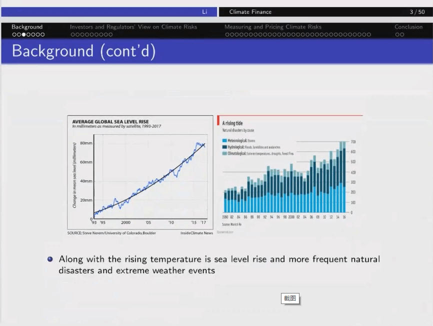 讲座初始,李伟凯教授从气候金融的背景着手,展现了气候风险在国际上引起广泛关注的现状,从1960年以来全球气温逐渐上升,伴随着气温的上升导致海平面上升、极端天气等频繁发生的自然灾害,同时也导致相关公司出现破产、海景房的贬值等问题。面对这样的变化,人们不再认为这仅仅是周期性的气候变化,而是更重视人类行为对气候的影响,并逐渐重视气候风险对金融市场的影响。