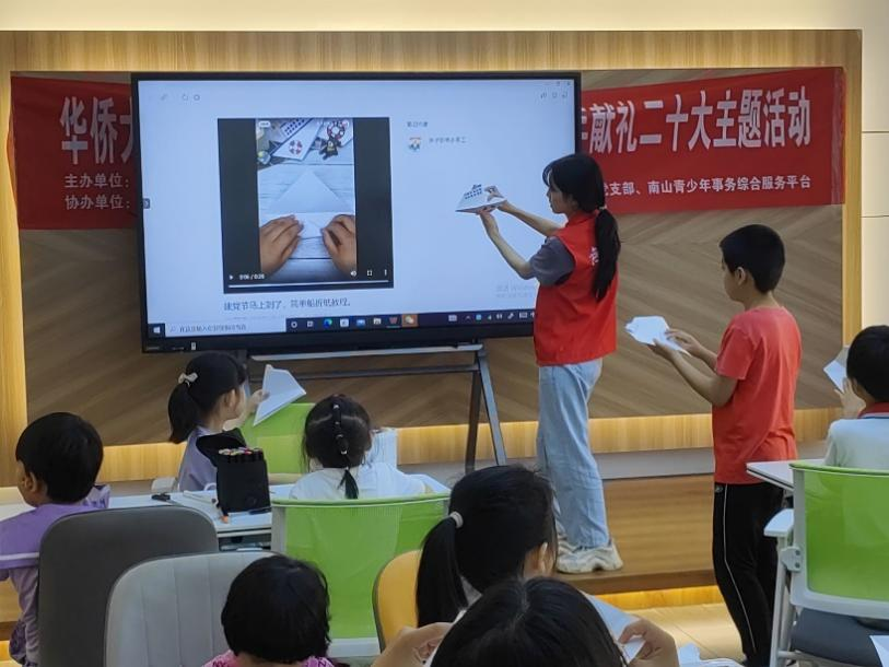 课堂分享环节结束后,党员志愿者们还通过“浸润式”的艺术形式,引导孩子们对着样图画出党旗,将小船组合、上色,在一步步制作纸红船的过程中,将党的优良传统、革命文化、红色精神等生动传递给孩子们,让孩子们在实践过程中身临其境,共同感悟开天辟地、敢为人先的红船精神,在他们心灵深处播下热爱党、热爱祖国的种子。